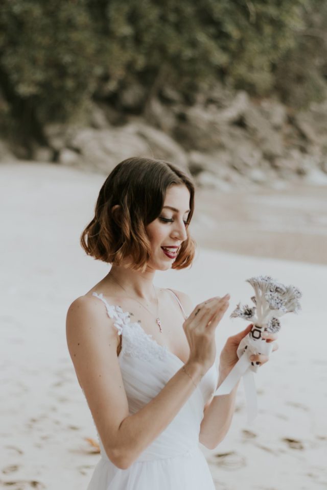 O vestido, o buquê, a gravatinha do noivo… a Ellen fez manualmente todas essas coisas lindas (dá pra acreditar?). Além de também ter pensado em TODOS os detalhes de uma mesa de doces maravilhosa para montarmos nesse ensaio na Praia do Éden. O que não contávamos era que precisaríamos passar por uma aventura pra conseguir ver o mar. Porque quando o GPS indicou nossa chegada, nos deparamos com uma trilha e com uma BELA descida entre as pedras no meio de uma mata fechada. Resultado: não deu pra levar a mesa, HAHA. Mas, conseguimos fazer uma boa improvisação usando as pedras da praia, e o resultado ficou tão maravilhoso quanto <3
